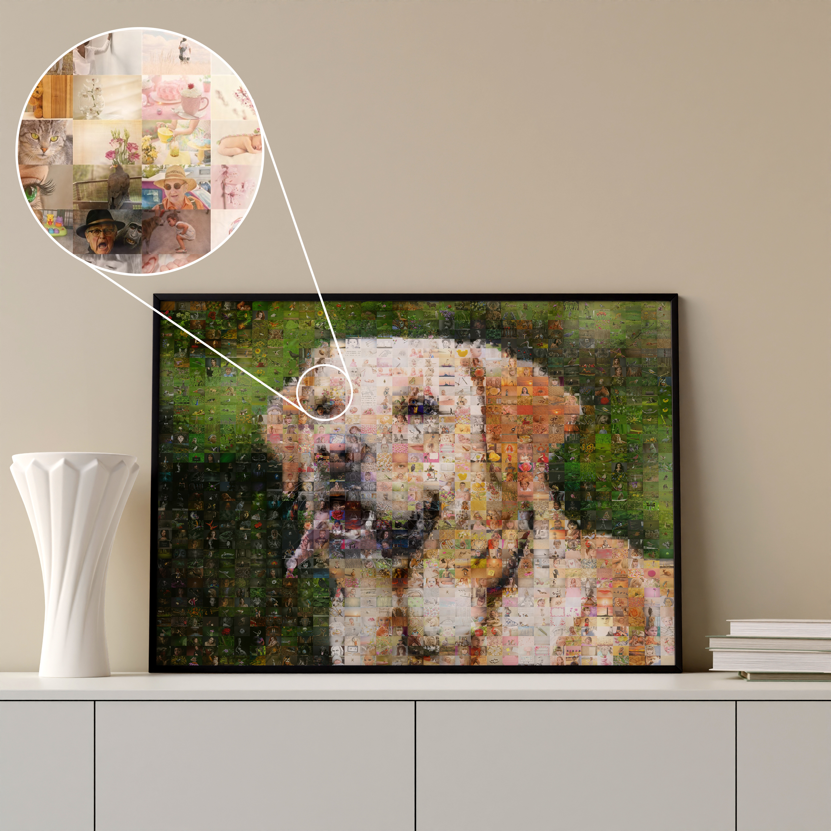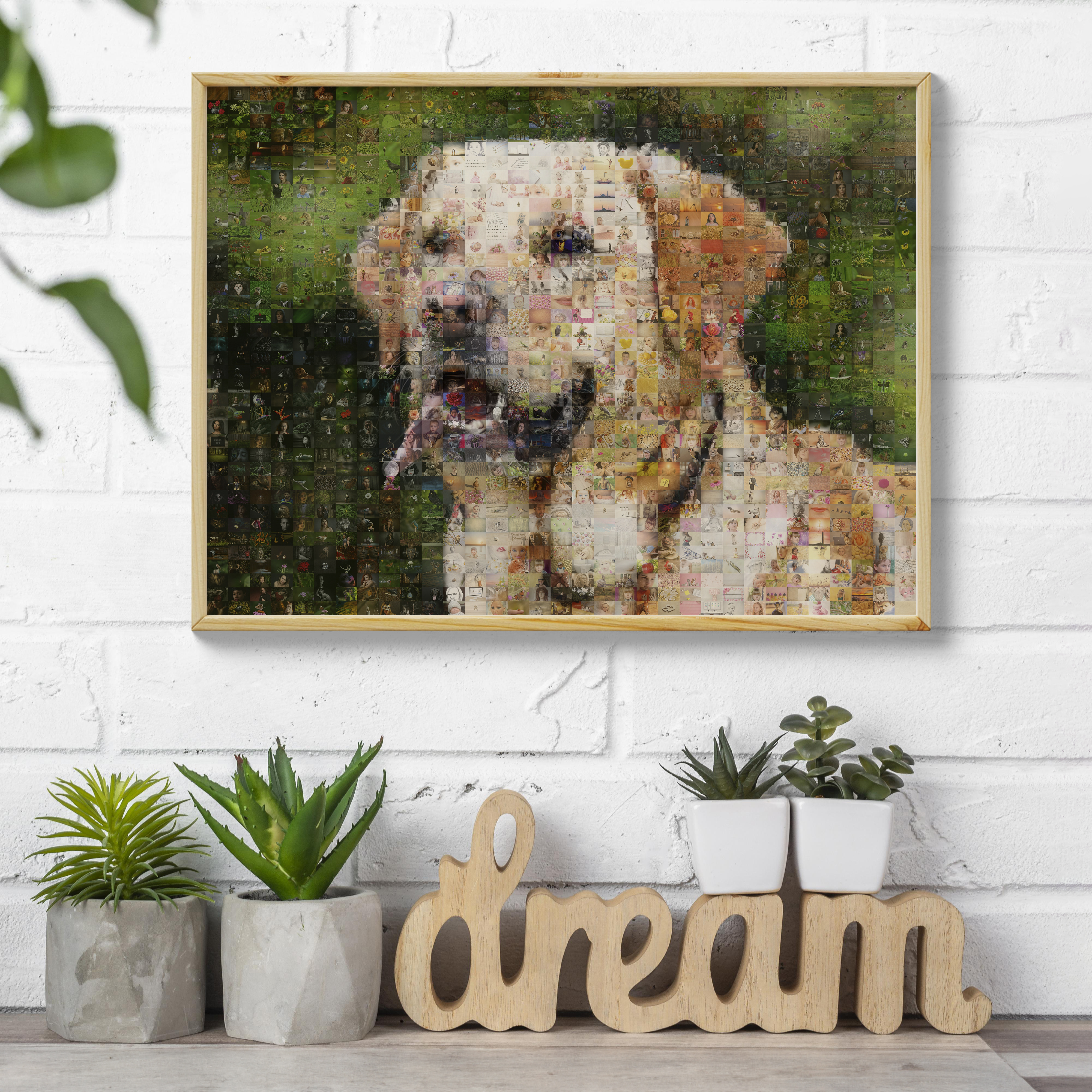 Realizza un capolavoro unico con il nostro fotomosaico personalizzato. Immagina il ritratto del tuo cane composto da centinaia di piccole foto che raccontano la vostra storia insieme. Perfetto per gli amanti dei cani o come regalo speciale per amici e famiglia. Un tocco decorativo unico per la tua casa o come ricordo indimenticabile.
